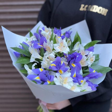 Букет из альстромерии, эустомы и ирисов в стильной упаковке “Ситцевый платочек”