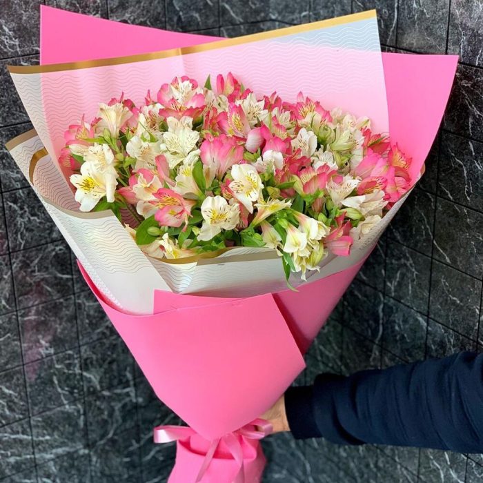 Альстромерия Микс Европа – 25 шт.Упаковка дизайнерская – 5 шт.Лента атласная – 1 шт.