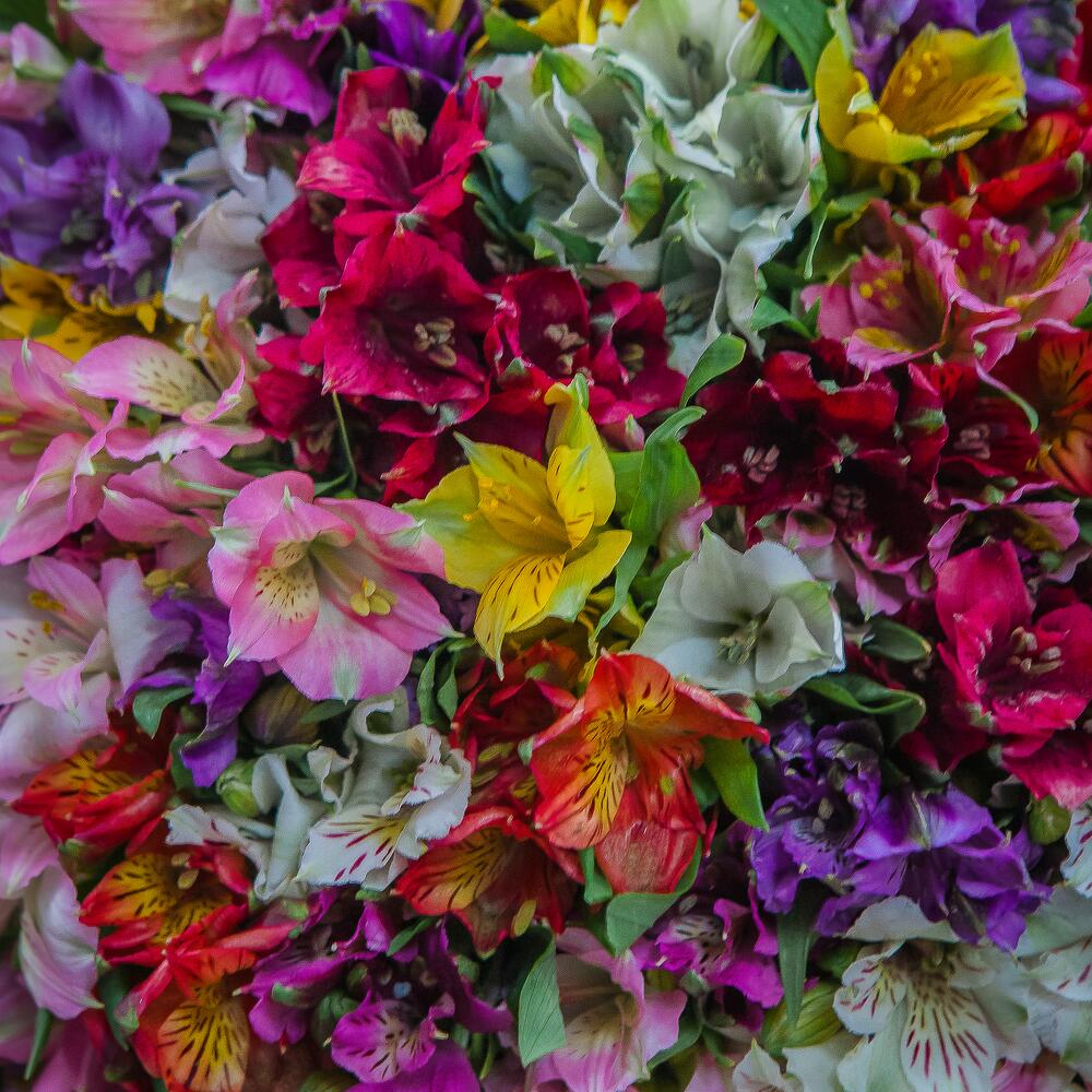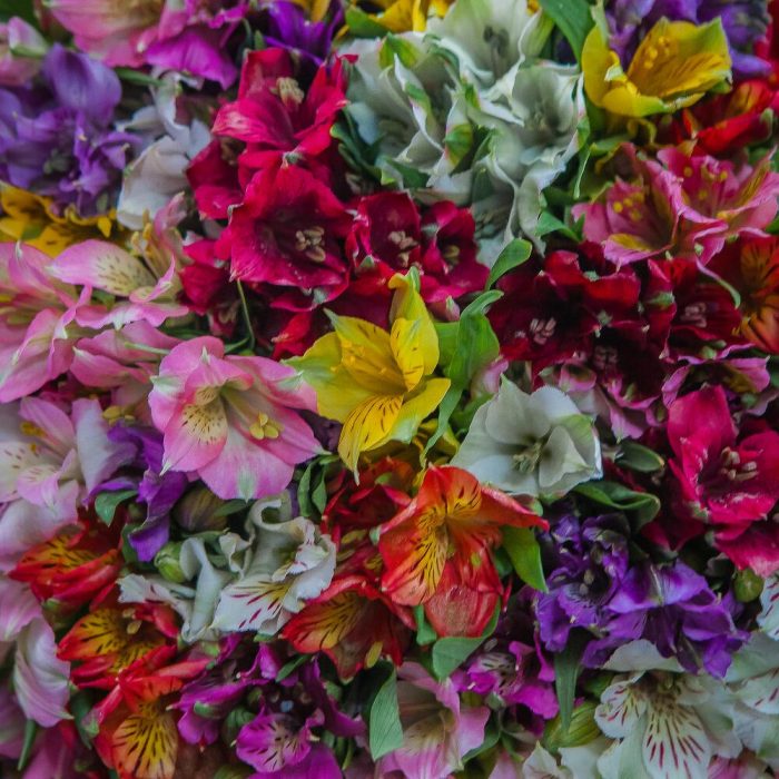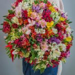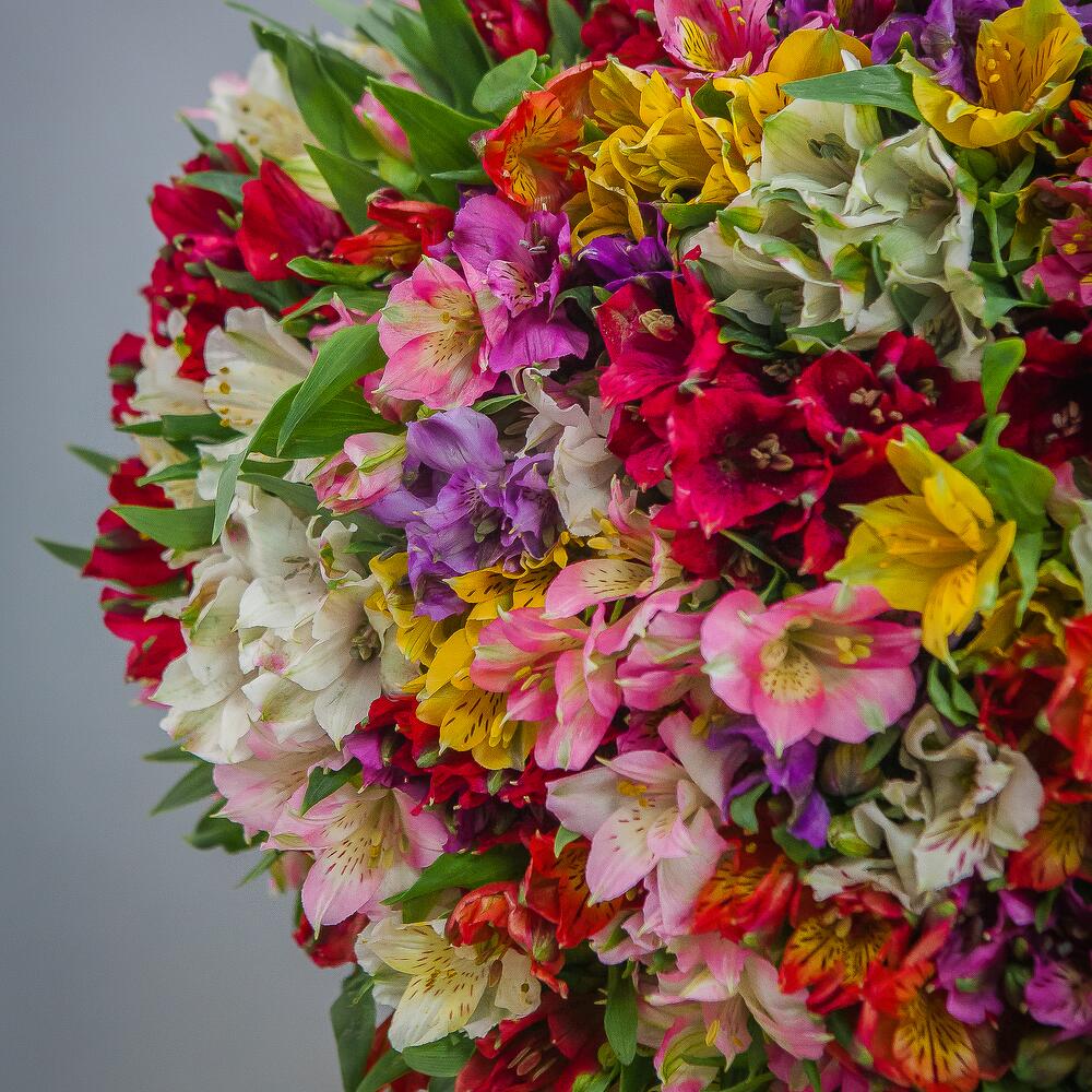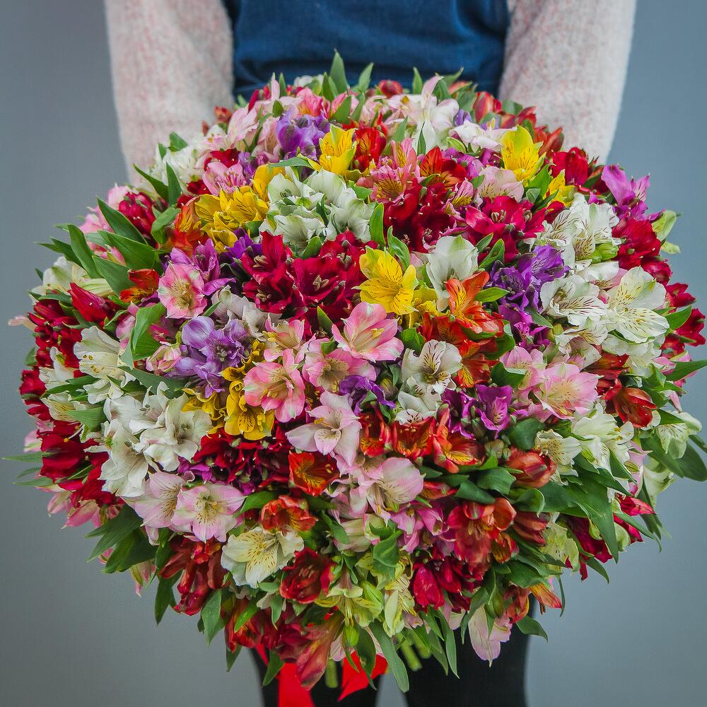 Альстромерия белая – 21 шт.Альстромерия розовая – 20 шт.Альстромерия красная – 20 шт.Альстромерия желтая – 20 шт.Альстромерия сиреневая – 20 шт.Атласная лента – 1 шт.