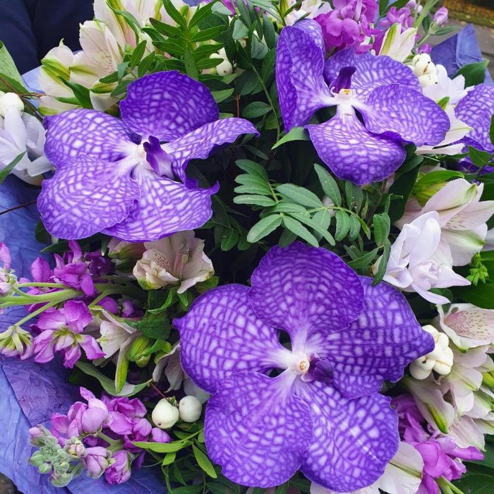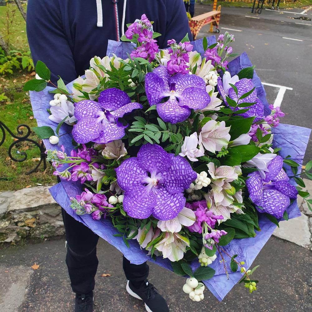 Ванда орхидея – 5 шт.Альстромерия – 7 шт.Фрезия – 5 шт.Маттиола – 7 шт.Фисташка – 1 шт.Рускус – 1 шт.Упаковка – 2 шт.