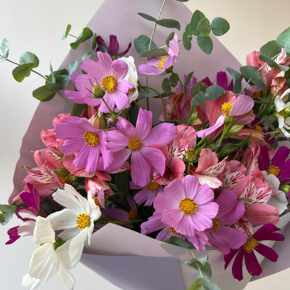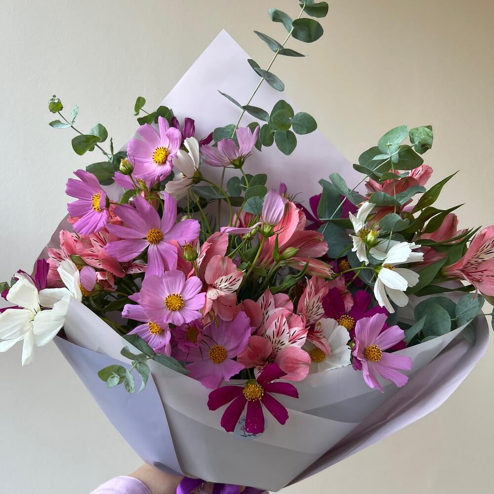 Альстромерии, Кустовые розы, Лизиантусы, Пионовидные розы, Розы, Ромашки
