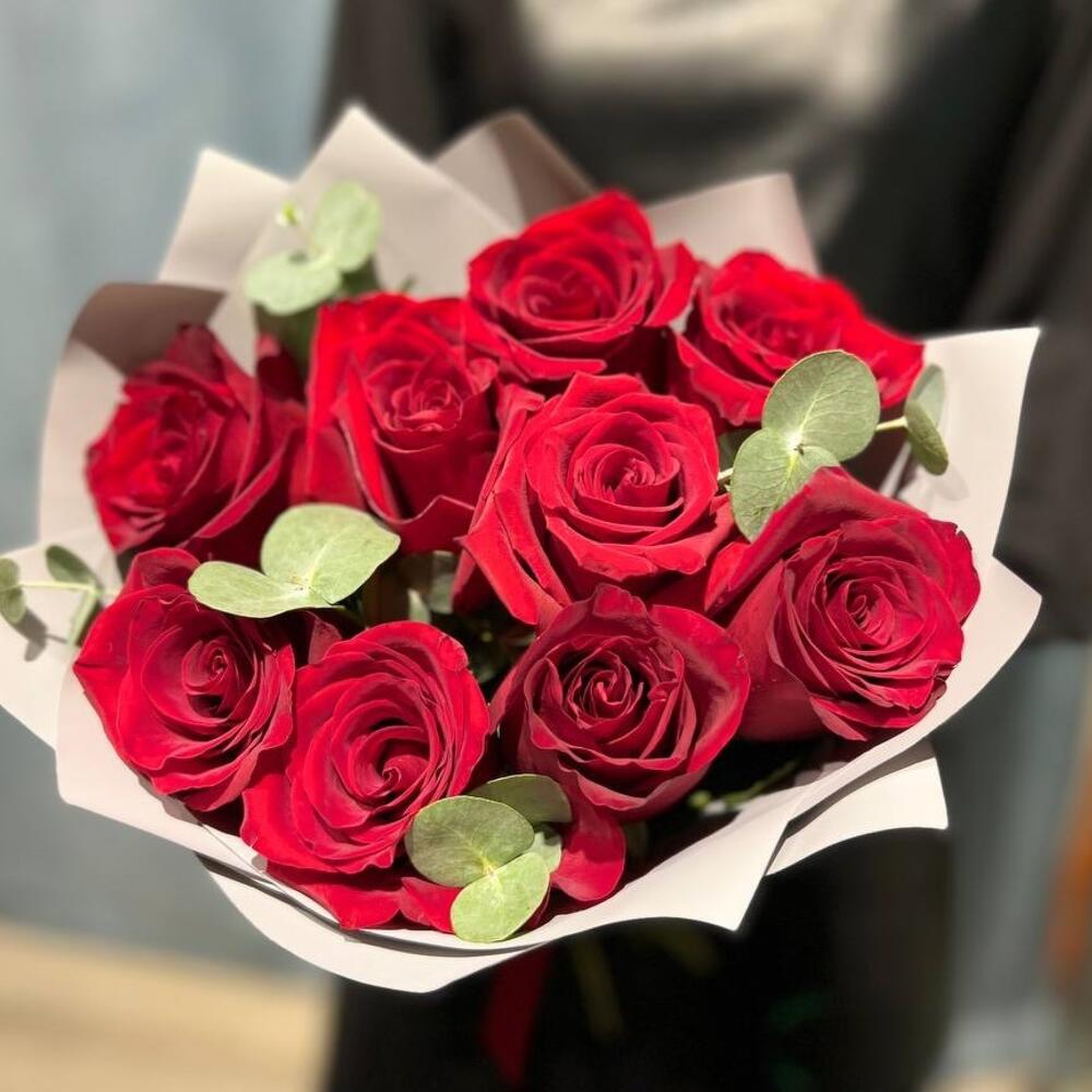 Эвкалипт – 3 шт.бордовые эквадорских розы – 9 шт.