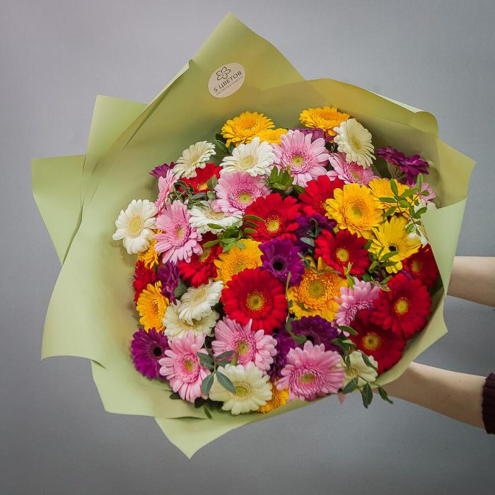 Гербера желтая – 13 шт.Гербера белая – 13 шт.Гербера розовая – 15 шт.Гербера красная – 10 шт.зелень салал – 1 шт.