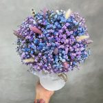 Коробка шляпная – 1 шт. Лагурус – 15 шт. Оазис флористический – 1 шт. гипсофила цветная – 7 шт.