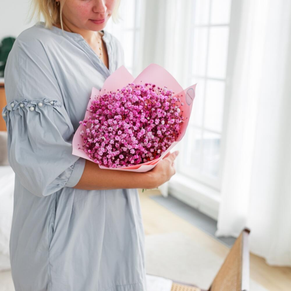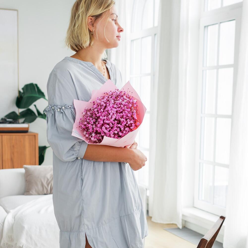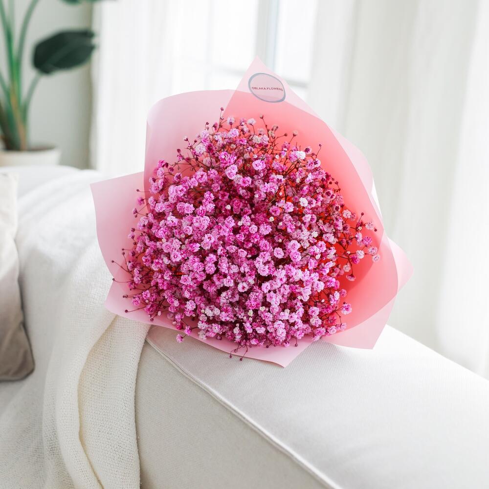 Очаровательный букет из воздушной гипсофилы. Ни одна дама, точно не останется равнодушной при виде такого букета .Инструкция по уходу за цветами прикреплена к каждому заказу.Цветы гипсофилы отличаются стойкостью и даже при высыхании не теряют, декоративности и цвета. Что позволяет, долгое время украшать интерьер в качестве сухоцветов.Подпишем открытку с вашими пожеланиями бесплатно