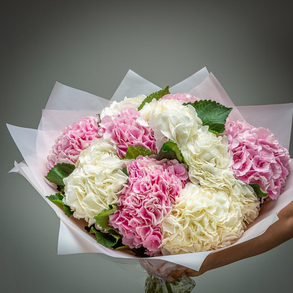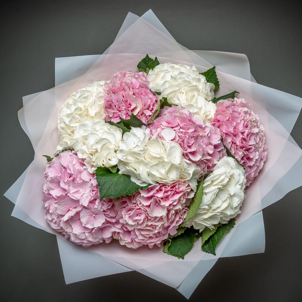 гортензия премиум розовая – 6 шт.гортензия премиум белая – 5 шт.Упаковка дизайнерская – 2 шт.Лента атласная – 2 шт.хорошее настроение – 100 шт.