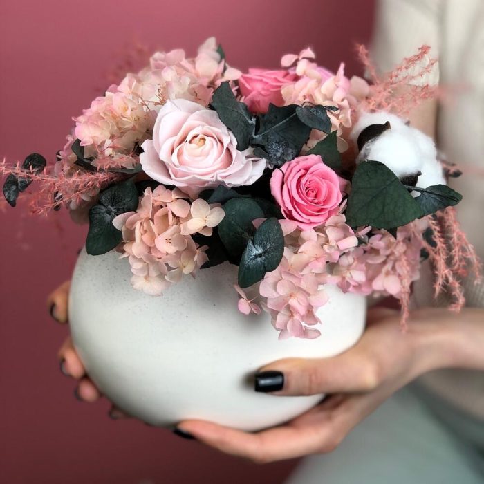 Хлопок – 3 шт.Керамическая ваза – 1 шт.гортензия стабилизированная – 15 шт.стабилизированные цветы микс – 5 шт.