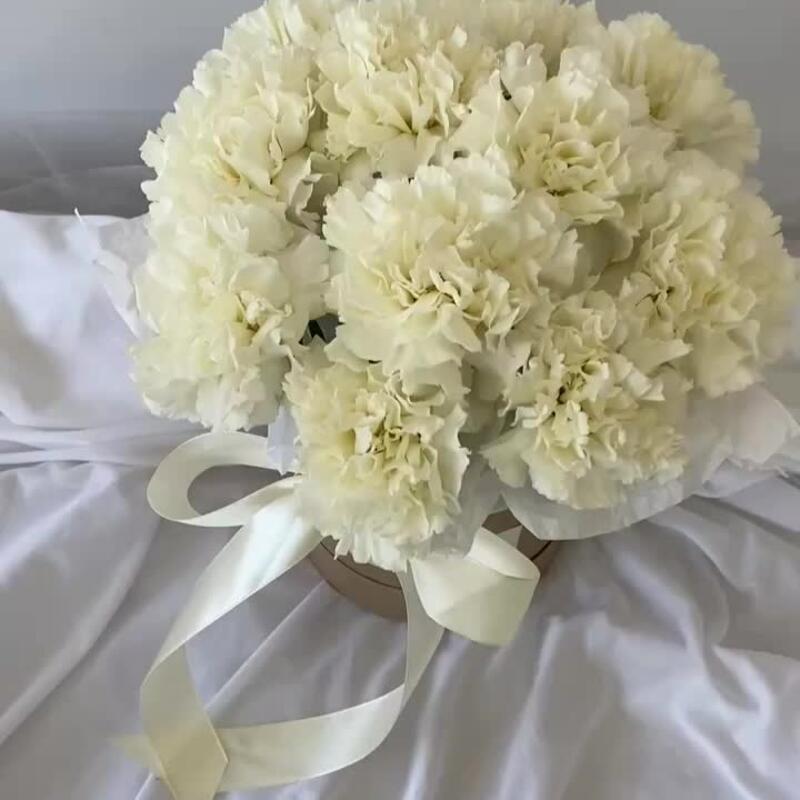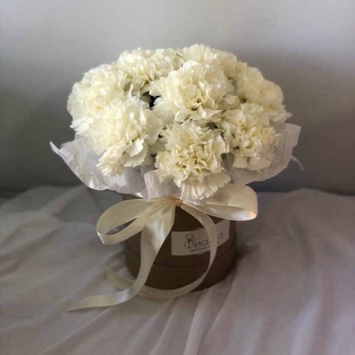 11 белых гвоздик в шляпной коробке