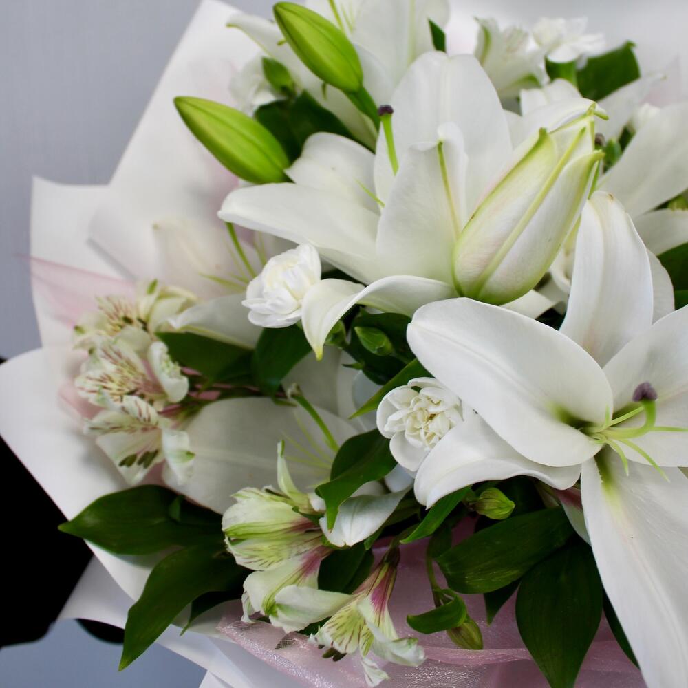 Альстромерия – 3 шт.Лилия – 2 шт.Рускус – 1 шт.Гвоздика кустовая – 4 шт.Упаковка дизайнерская – 3 шт.
