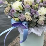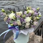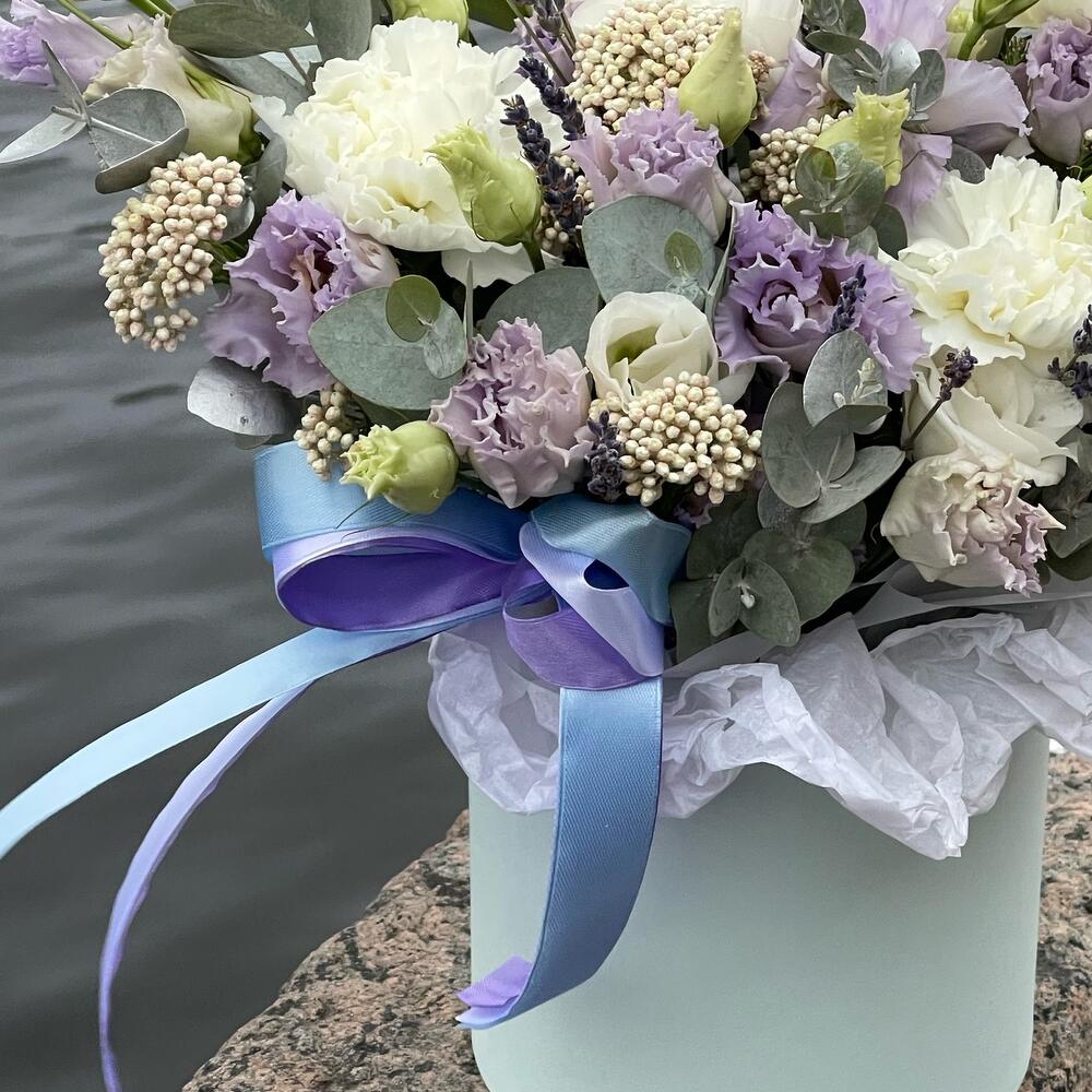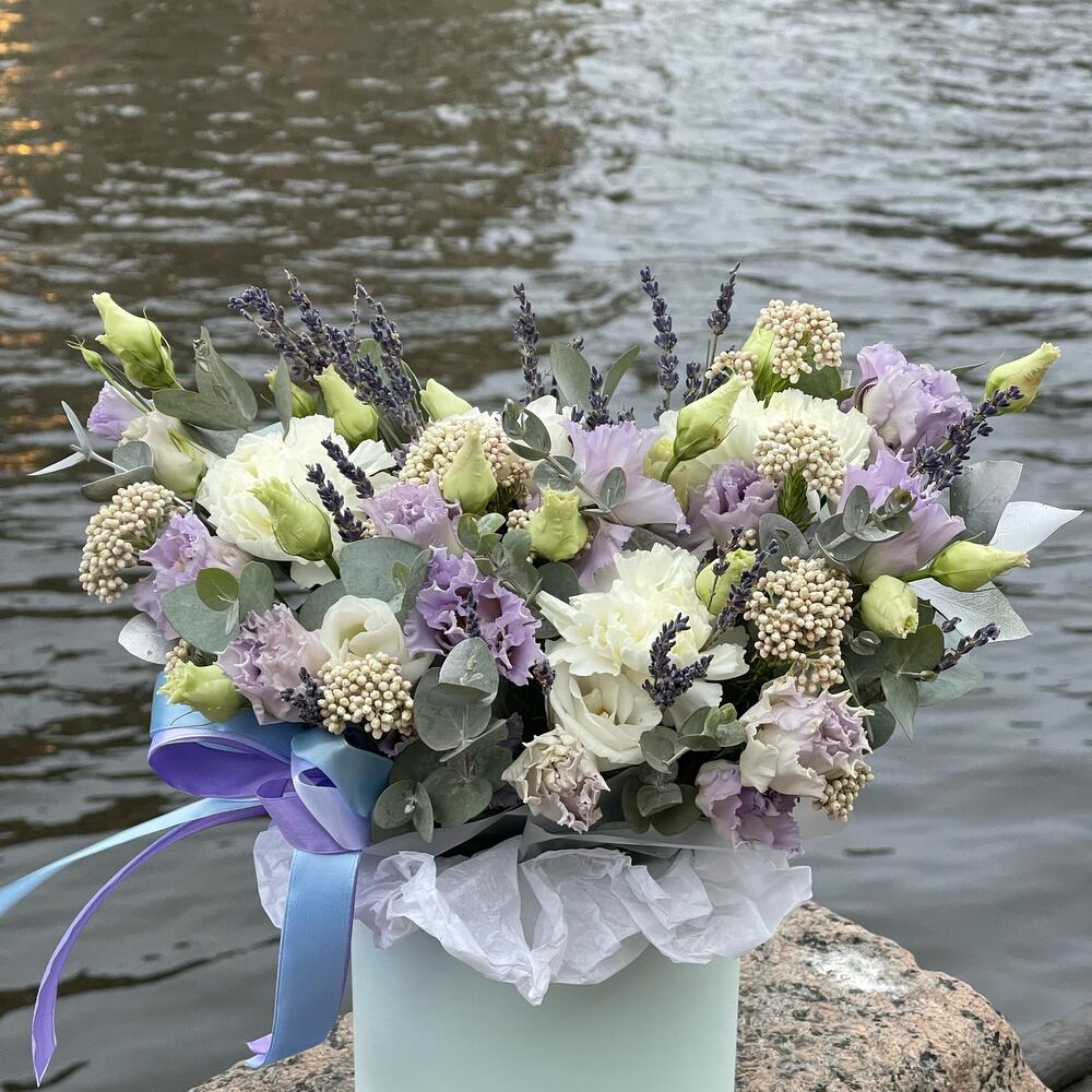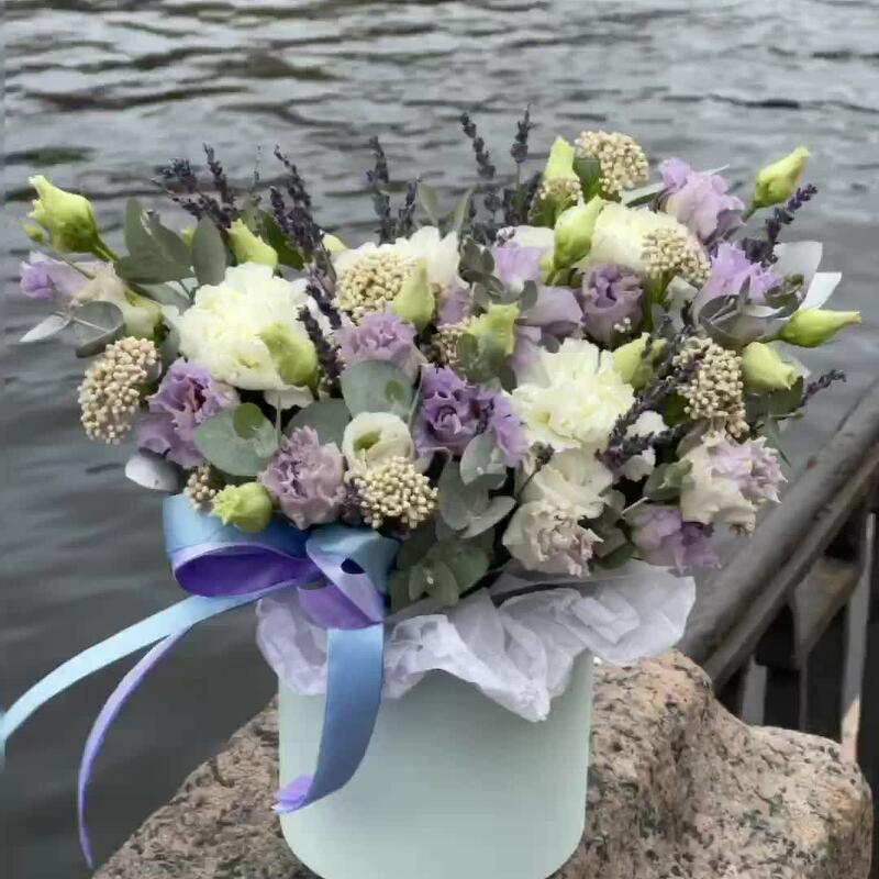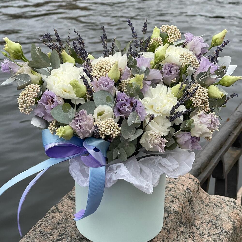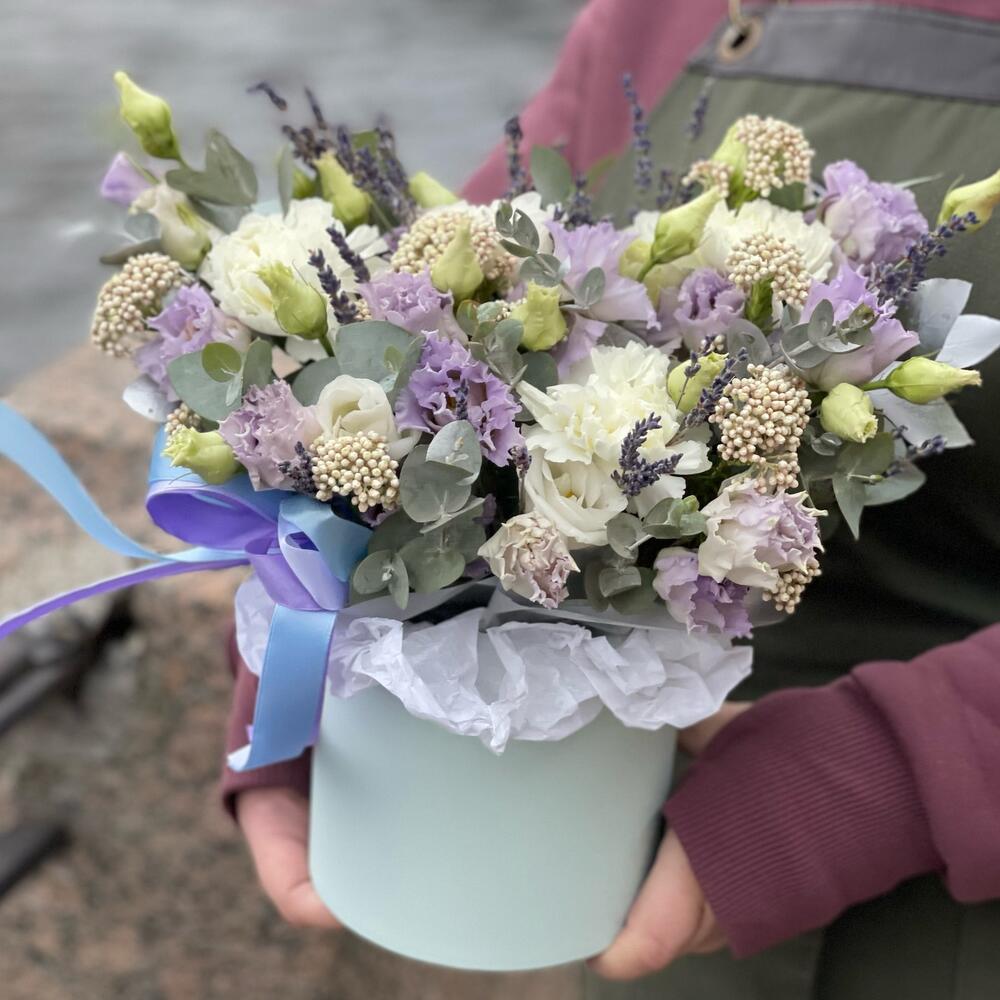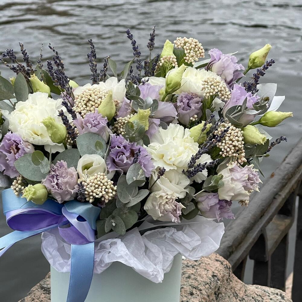 Лаванда – 25 шт.Эустома – 4 шт.Диантус – 3 шт.Озотамнус – 3 шт.Эвкалипт – 2 шт.Оазис флористический – 1 шт.Коробка шляпная – 1 шт.