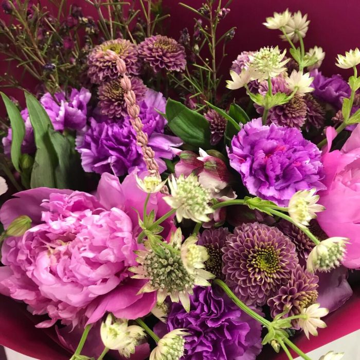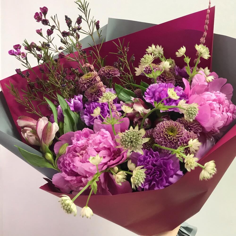 Альстромерия – 2 шт.Лаванда – 2 шт.Пион – 2 шт.Хризантема Сантини – 3 шт.Гвоздика – 5 шт.Хамелациум – 1 шт.Астранция – 2 шт.Открыточка с вашими пожеланиями – 1 шт.Авторская упаковка – 1 шт.