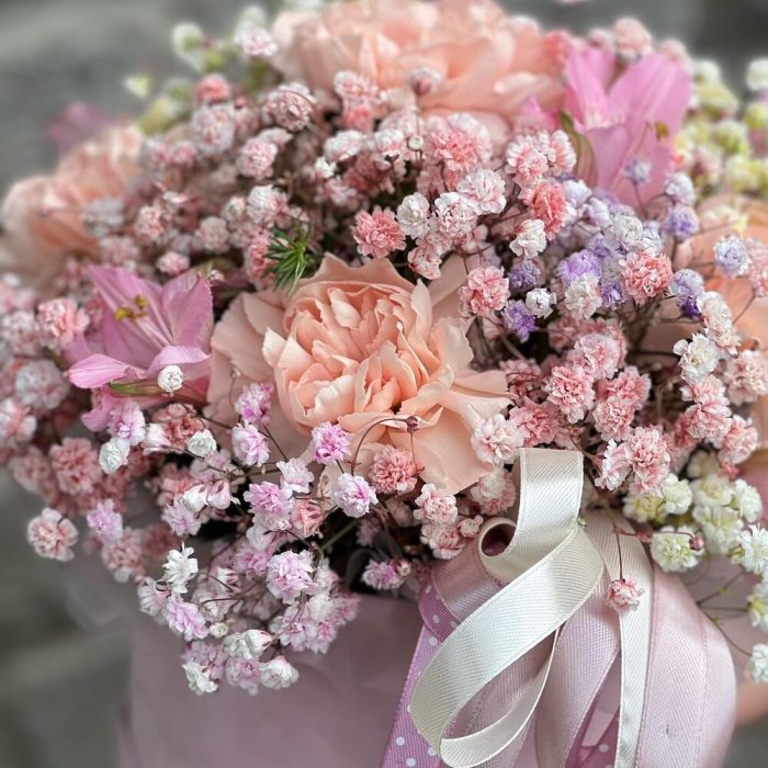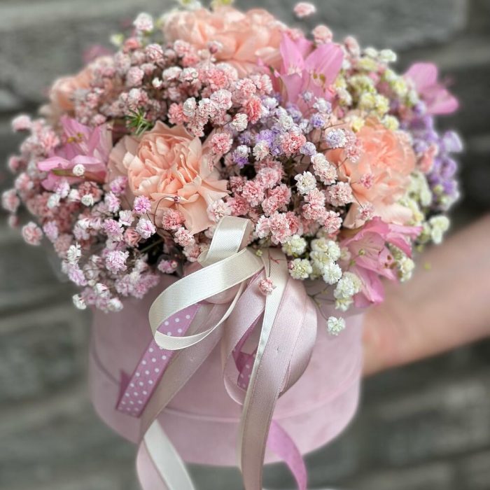 Диантус – 5 шт. Альстромерия – 2 шт. гипсофила радужная – 3 шт. Эвкалипт – 1 шт. Коробка шляпная – 1 шт. Лента атласная – 3 шт.