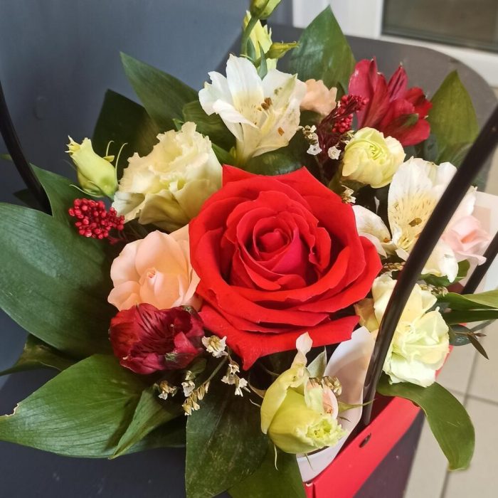 Красивая композиция в сумочке, поднимет настроение и порадует легкостью в уходе за срезанными цветами, т.к не требуется ваза и смена воды для цветовЦветы находятся в специальной флористической губке с антибактериальным свойством , для поддержания свежести цветов доливайте немного чистой воды в губку 1 раз в 2-3 дня и наслаждайтесь красотой цветов.Состав композиции может меняться, оставаясь в той же цветовой гамме