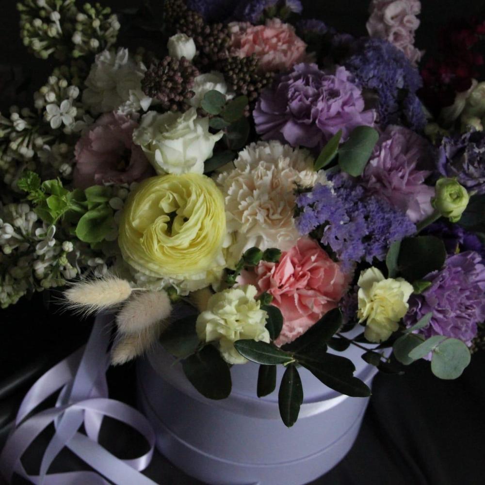 Шляпная коробка с сиренью, статицей, маттиолой, гвоздиками, ранункулюсами, лизиантусом и лагурусом эвкалиптом.Стильное цветочное решение для любого случая.