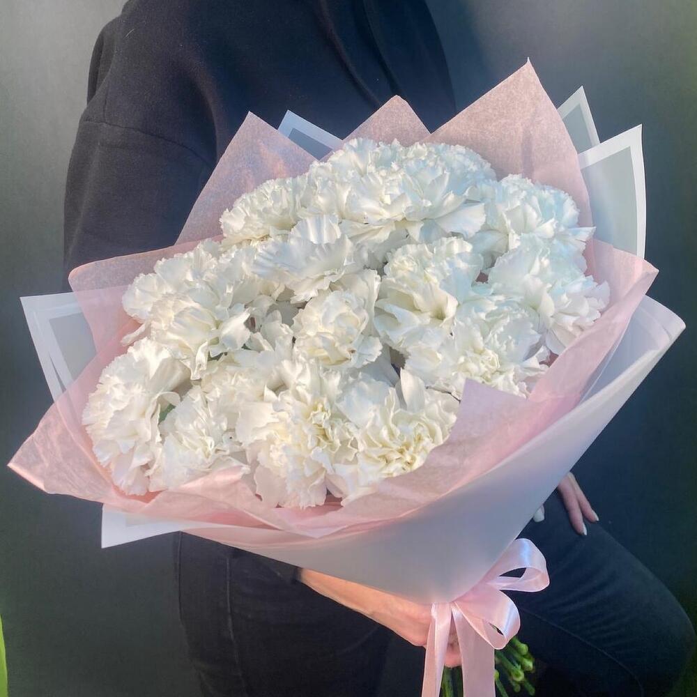 Упаковка дизайнерская – 3 шт.Тишью белое – 2 шт.гвоздика белая сортовая – 19 шт.