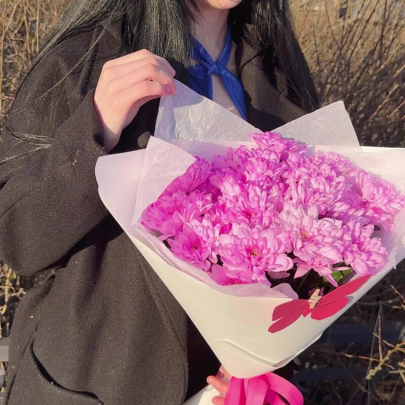 Лента атласная – 1 шт.Открыточка с вашими пожеланиями – 1 шт.Хризантема кустовая крашенная розовая – 5 шт.Тишью белое – 2 шт.пленка матовая белая – 2 шт.