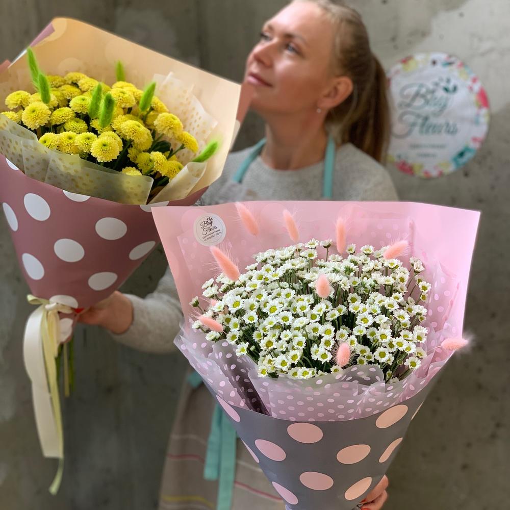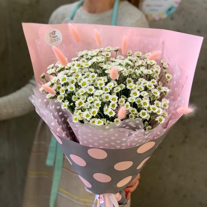 Хризантема кустовая – 5 шт.Лагурус – 10 шт.Упаковка дизайнерская – 1 шт.Лента атласная – 2 шт.