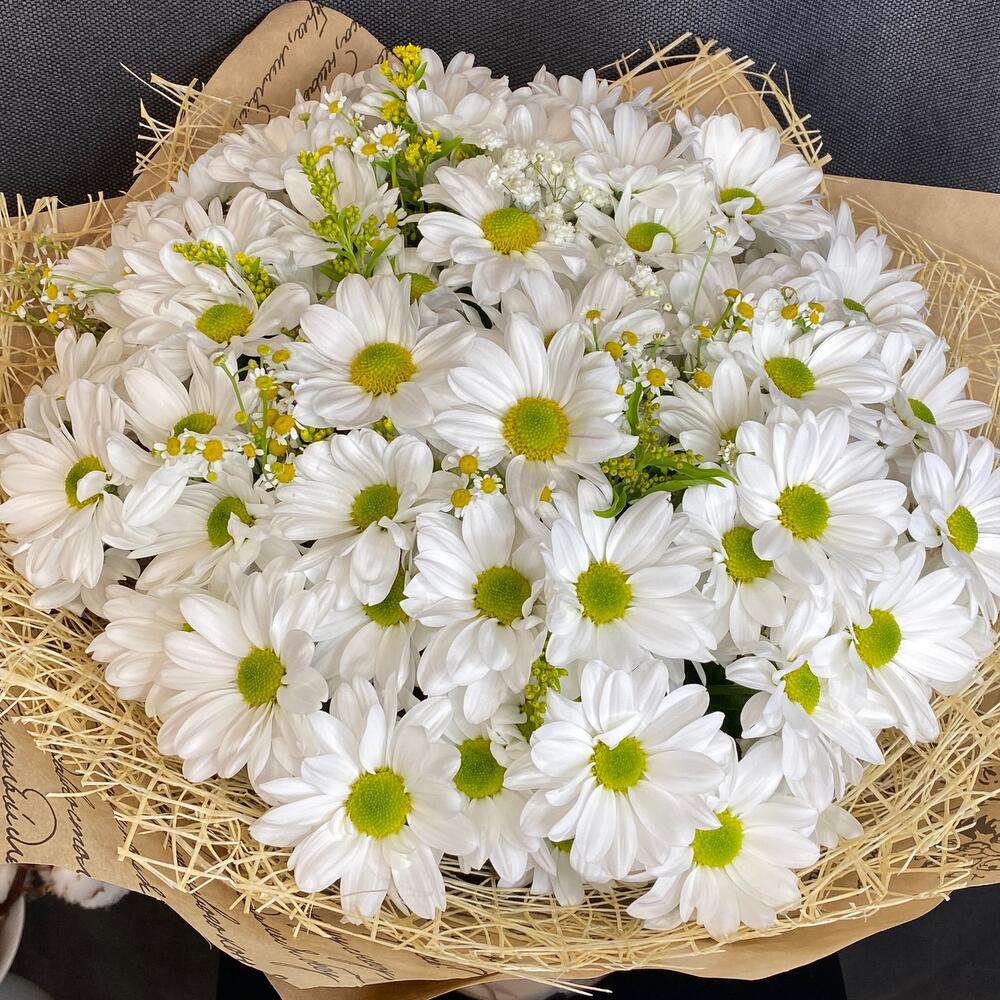 Гипсофила – 1 шт.Солидаго – 2 шт.Хризантема кустовая – 9 шт.Лента атласная – 1 шт.Матрикария – 5 шт.Крафт – 1 шт.Сетка – 1 шт.