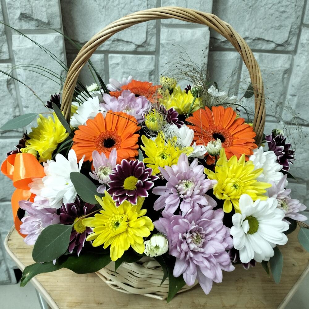 Эвкалипт – 2 шт.Лента атласная – 1 шт.Гербера мини – 3 шт.Оазис флористический – 1 шт.Хризантема кустовая микс – 5 шт.корзина плетенная средняя – 1 шт.Паникум Фонтан – 1 шт.