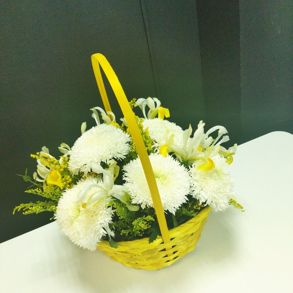 Хризантема – 7 шт.Ирис – 7 шт.Солидаго желтое – 3 шт.Корзина плетеная – 1 шт.