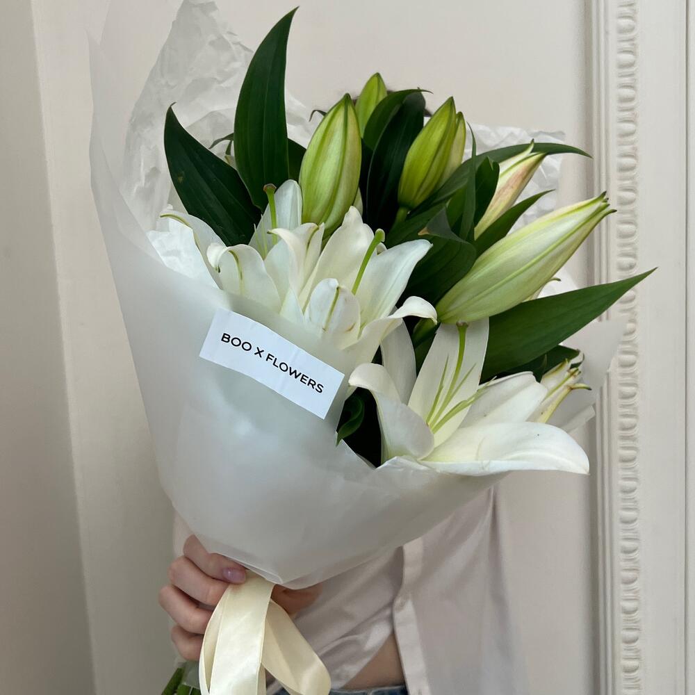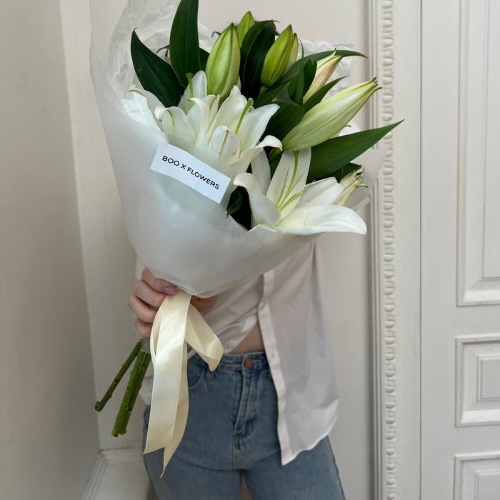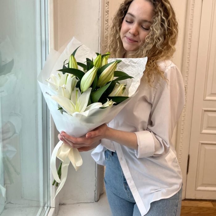 Лилия – 3 шт.Лента атласная – 1 шт.Дизайнерская упаковка – 1 шт.