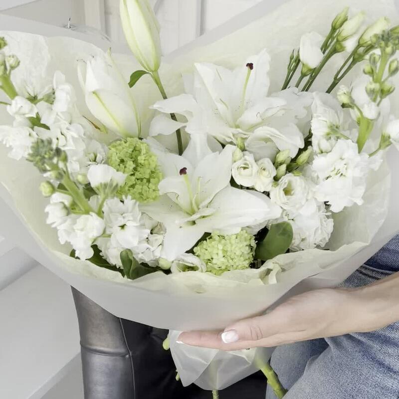 Вибурнум – 3 шт.Лизиантус – 3 шт.Маттиола – 3 шт.Лента атласная – 1 шт.Упаковка дизайнерская – 6 шт.лилия дабл – 1 шт.