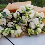 Красивый букет белоснежных эустом, оформленный во флористическую кальку светлых оттенков.