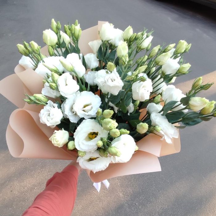 Красивый букет белоснежных эустом, оформленный во флористическую кальку светлых оттенков.