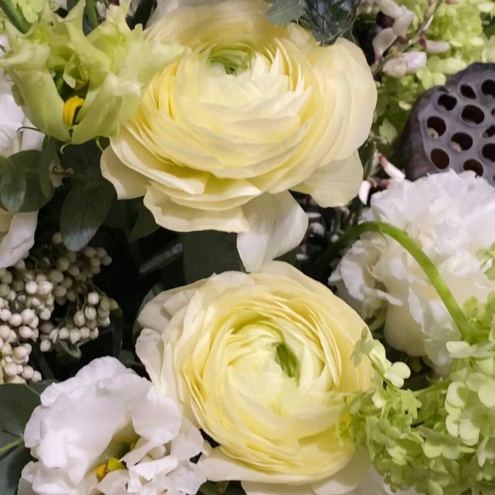 Ранункулюс – 11 шт.Лизиантус – 7 шт.Дрок – 3 шт.Хедера – 3 шт.Лотос (коробочка) – 5 шт.Колючка – 3 шт.Озотамнус – 3 шт.Колокольчик – 3 шт.Эвкалипт – 11 шт.Вибурнум – 3 шт.Лента – 1 шт.