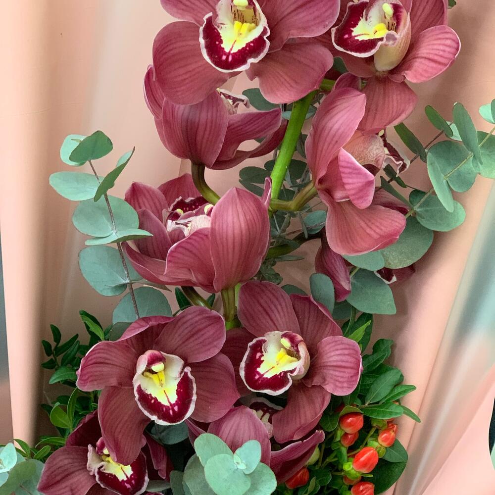 Орхидея Цимбидиум – 1 шт.эвколиптом – 1 шт.Гиперикум – 1 шт.Дизайнерская упаковка – 3 шт.