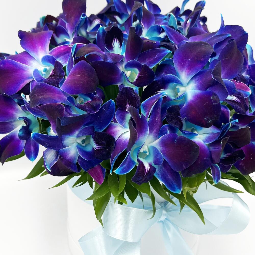 орхидея дендробиум синяя бутоны – 51 шт.удлинитель для орхидеи – 25 шт.Шляпная коробка – 1 шт.Губка флористическая – 1 шт.любовь флориста (бесплатно) – 1 шт.инструкция по уходу за цветами – 1 шт.Средство для продления жизни цветов – 1 шт.Зелень – 1 шт.
