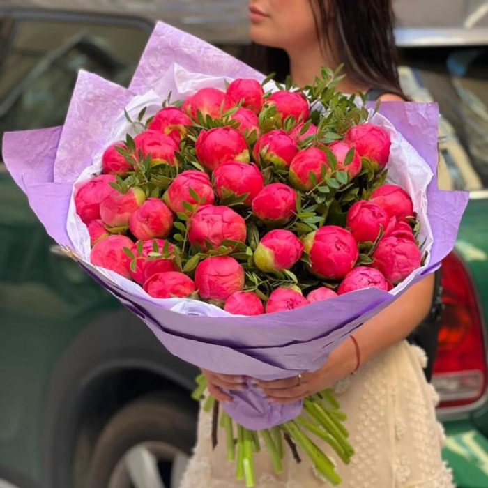 35 коралловых пионов с зеленью и оформлением