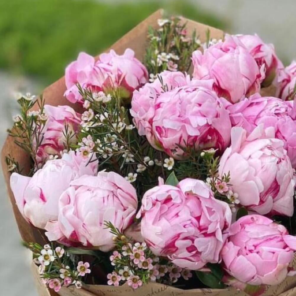 Пион розовый – 15 шт.Хамелациум – 10 шт.Упаковка дизайнерская – 2 шт.Лента атласная – 2 шт.Открыточка с вашими пожеланиями – 1 шт.хорошее настроение – 100 шт.инструкция по уходу за цветами – 1 шт.коробка переноска – 1 шт.Кризал – 1 шт.