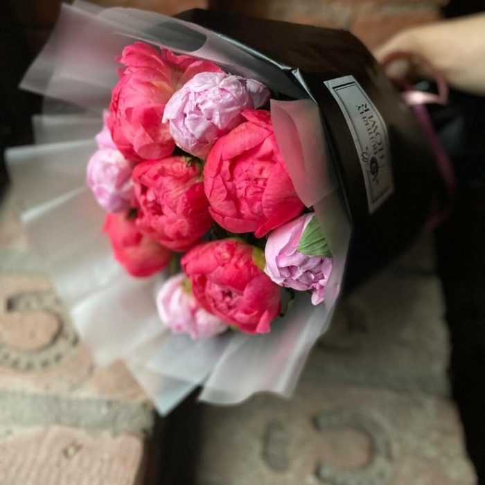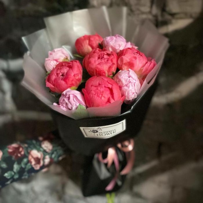Букет из 9 коралловых и розовых пионов в дизайнерской упаковке “Рафаэль”