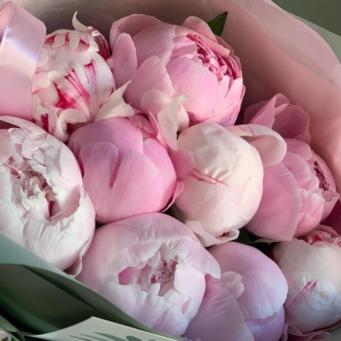 Лента атласная – 4 шт.Пион Сара Бернар – 9 шт.Упаковка дизайнерская – 4 шт.Средство для продления жизни цветов – 2 шт.инструкция по уходу за цветами – 1 шт.