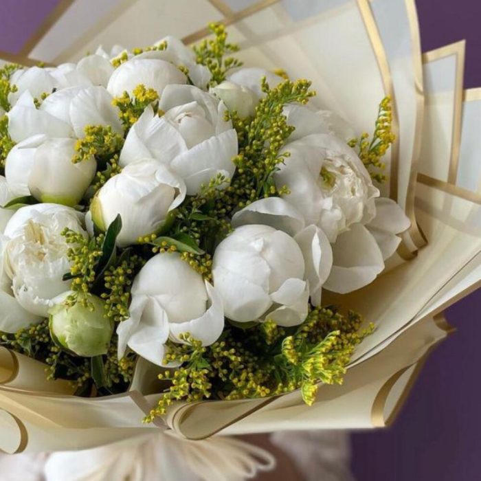 Пион белый – 21 шт.Мимоза – 16 шт.Упаковка дизайнерская – 2 шт.Лента атласная – 2 шт.Открыточка с вашими пожеланиями – 1 шт.хорошее настроение – 100 шт.инструкция по уходу за цветами – 1 шт.коробка переноска – 1 шт.Кризал – 1 шт.