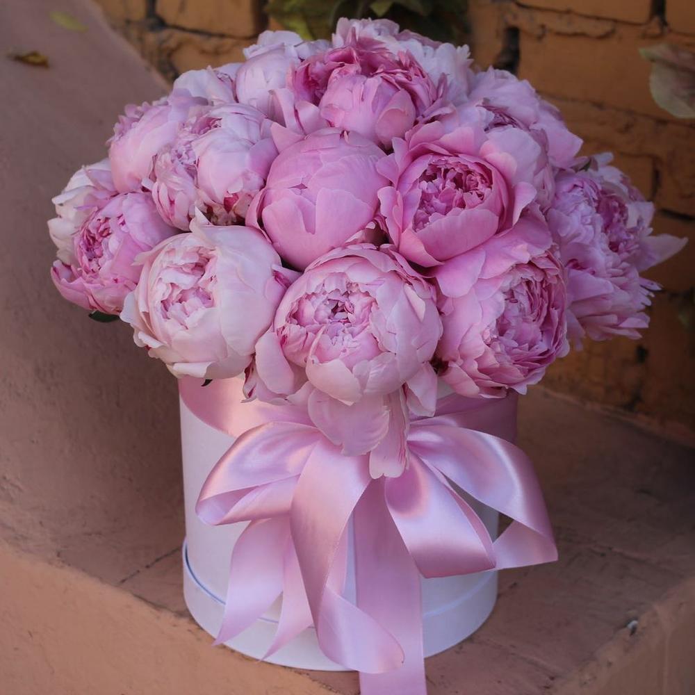 Пион Сара Бернар – 25 шт.Коробка шляпная – 1 шт.Оазис – 1 шт.Лента атласная – 1 шт.