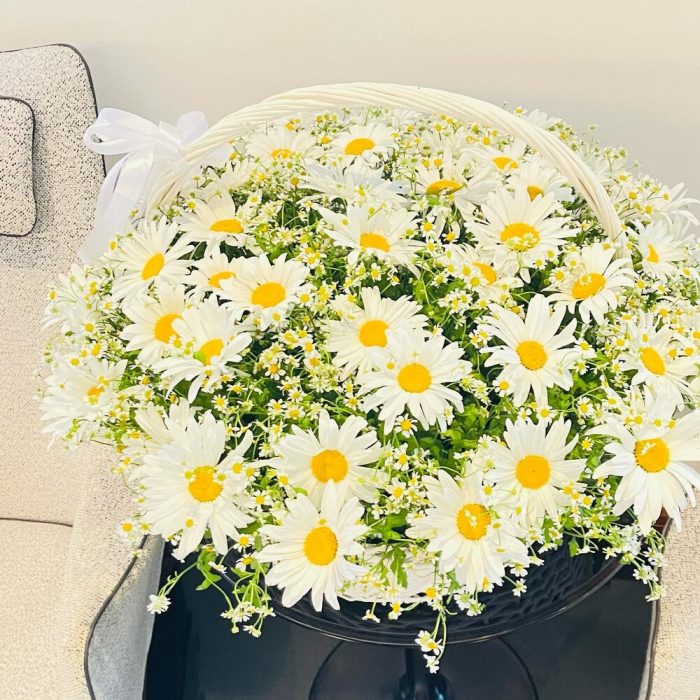 Ромашка одноголовая – 51 шт.Ромашка кустовая – 100 шт.Корзина плетеная – 1 шт.Лента атласная – 2 шт.Кризал – 1 шт.Открыточка с вашими пожеланиями – 1 шт.инструкция по уходу за цветами – 1 шт.хорошее настроение – 100 шт.