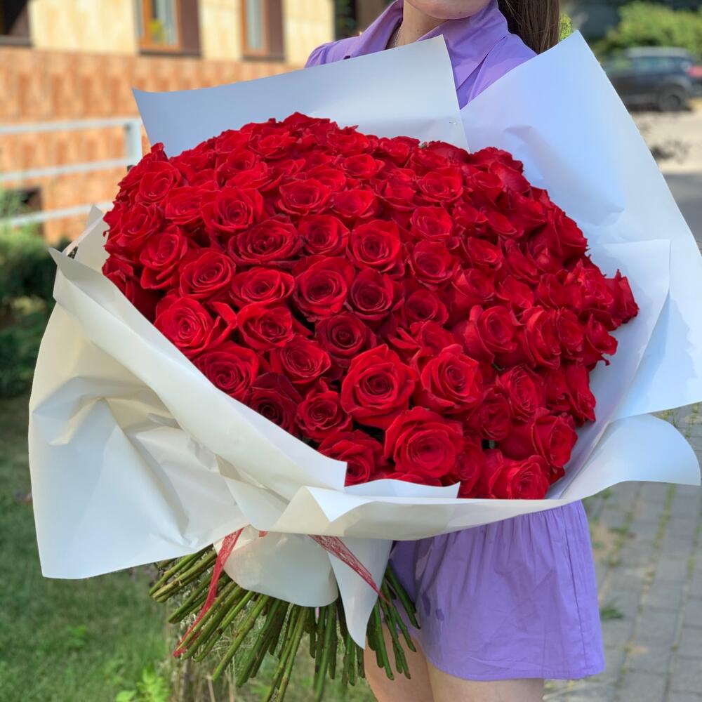Букет, который впечатляет однозначно и бесповоротно. Букет из 101 розы. Чтобы каждый букет чувствовал себя хорошо долгое время, мы крепим пакетик кризала-средство, продлевающее жизнь цветочков