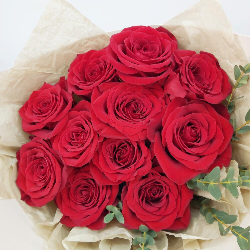 Эвкалипт – 1 шт.Роза Эквадор – 11 шт.Лента атласная – 1 шт.Упаковка тишью – 4 шт.Упаковка фоамиран – 2 шт.любовь флориста (бесплатно) – 1 шт.