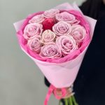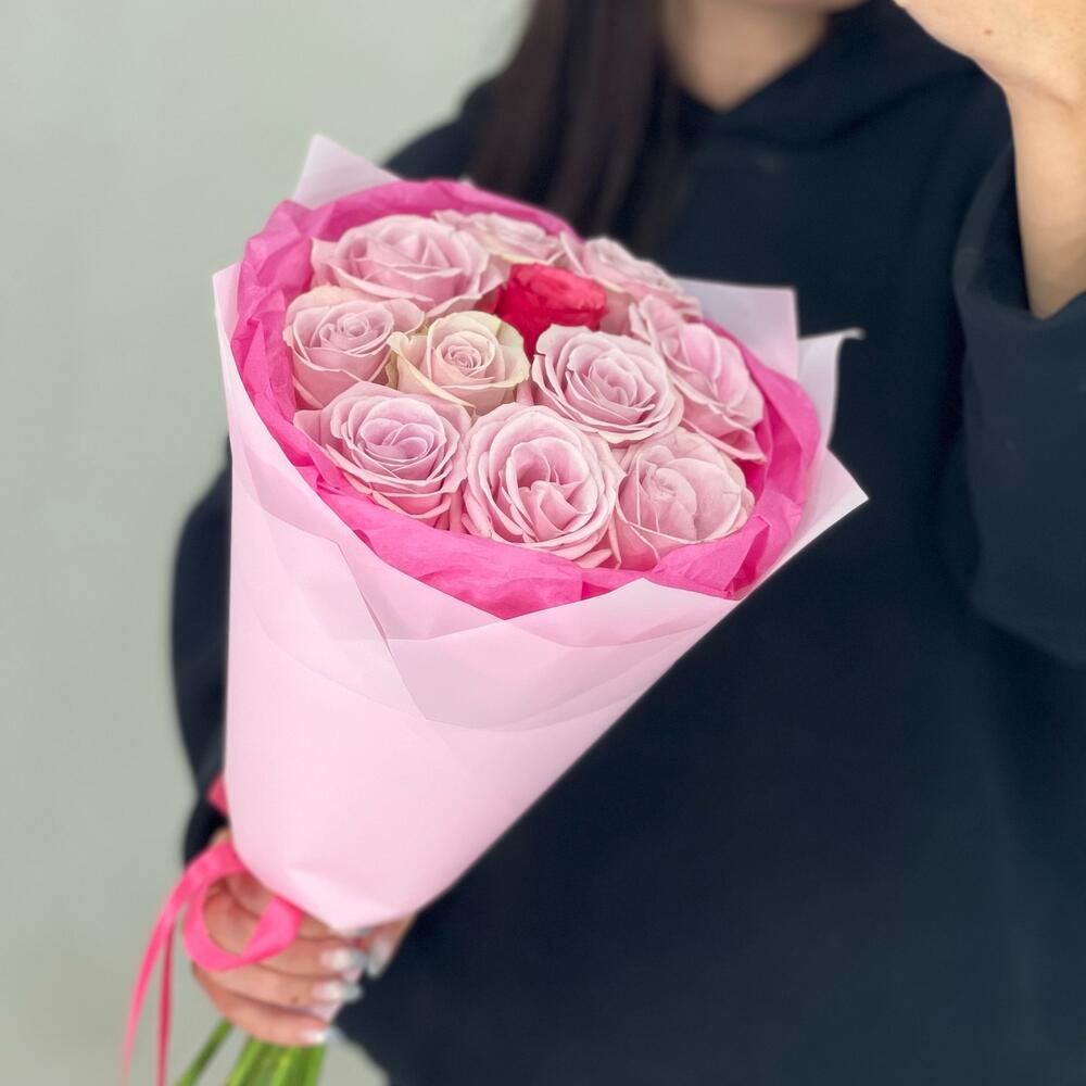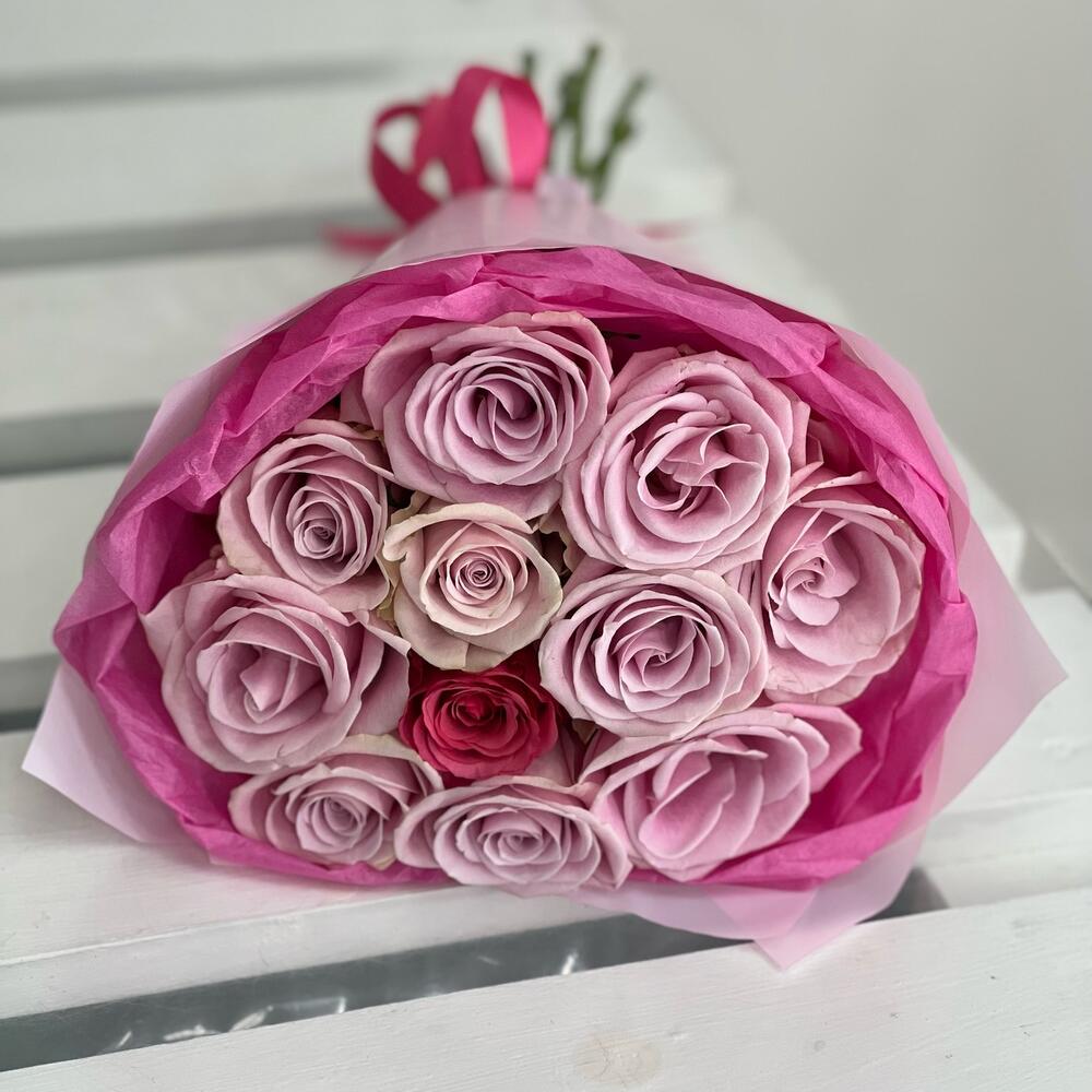 Лента атласная – 1 шт.Упаковка дизайнерская – 1 шт.роза нежно розовая кения – 10 шт.роза яркая кения – 1 шт.