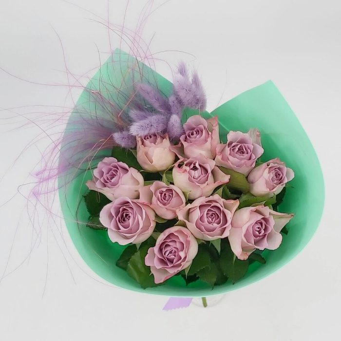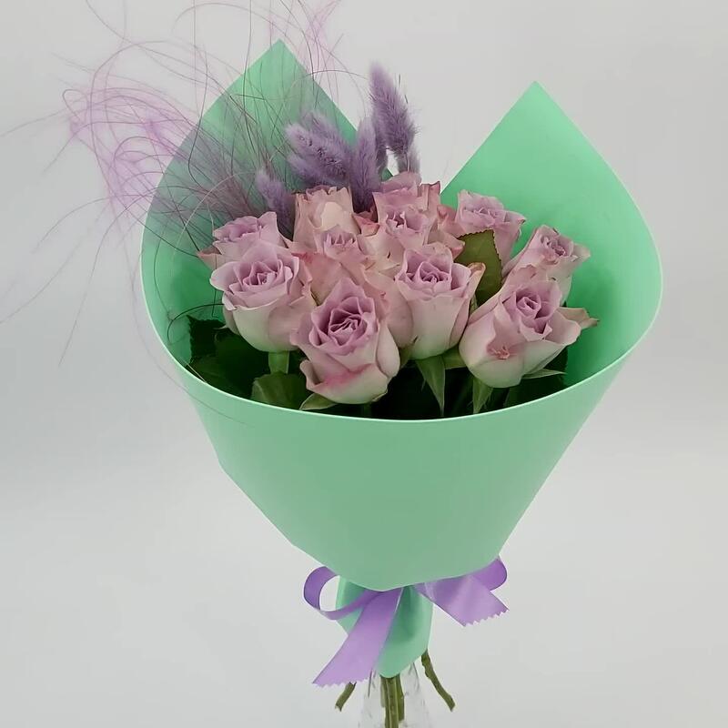 Лента атласная – 1 шт.Лагурус – 9 шт.Упаковка фоамиран – 1 шт.Роза мемори лэйн – 11 шт.стифа пучок – 1 шт.
