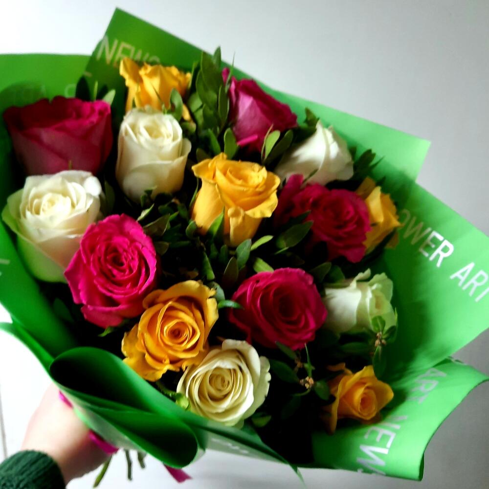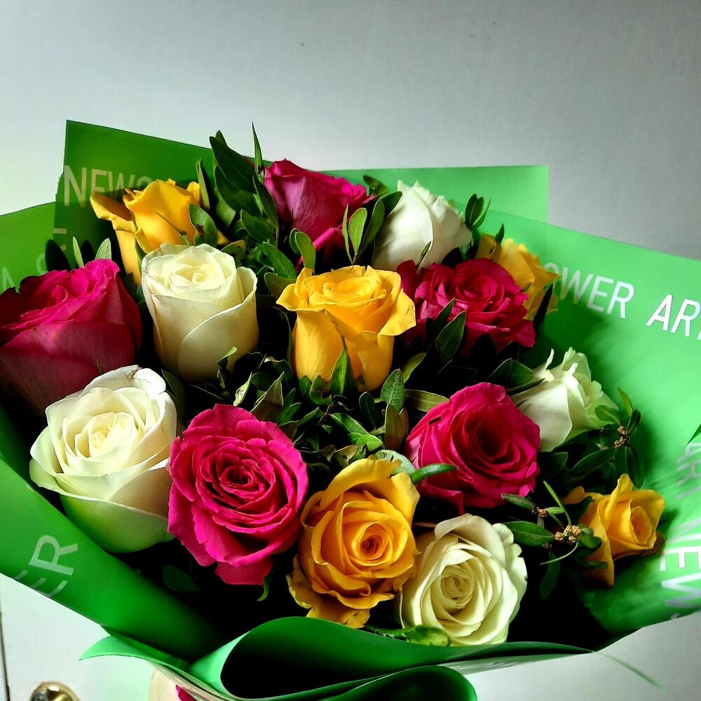 15 роз микс с зеленью
