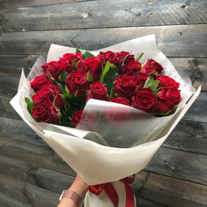 Лента – 1 шт.Упаковка – 2 шт.Роза красная 50 см – 25 шт.