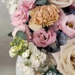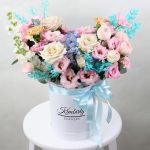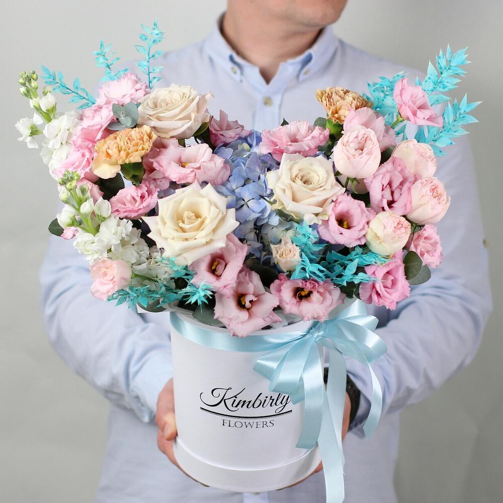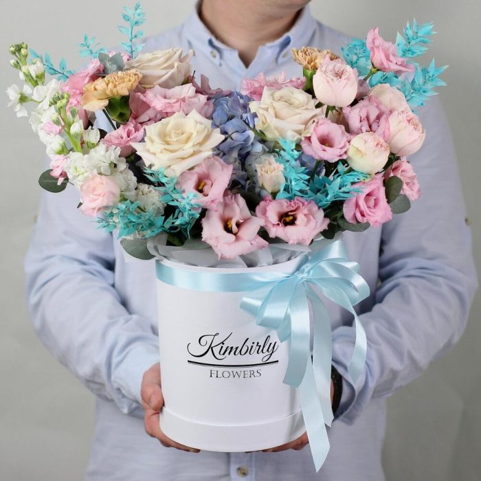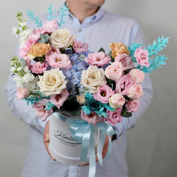 Эвкалипт – 8 шт.Гвоздика – 2 шт.Лента атласная – 1 шт.Коробка шляпная – 1 шт.Гортензия голубая – 1 шт.эустома розовая – 3 шт.Маттиола белая – 2 шт.Роза одноголовая мента – 3 шт.Губка флористическая – 1 шт.рускус стабилизированный – 4 шт.роза кустовая пионовидная мэнсфилд – 1 шт.