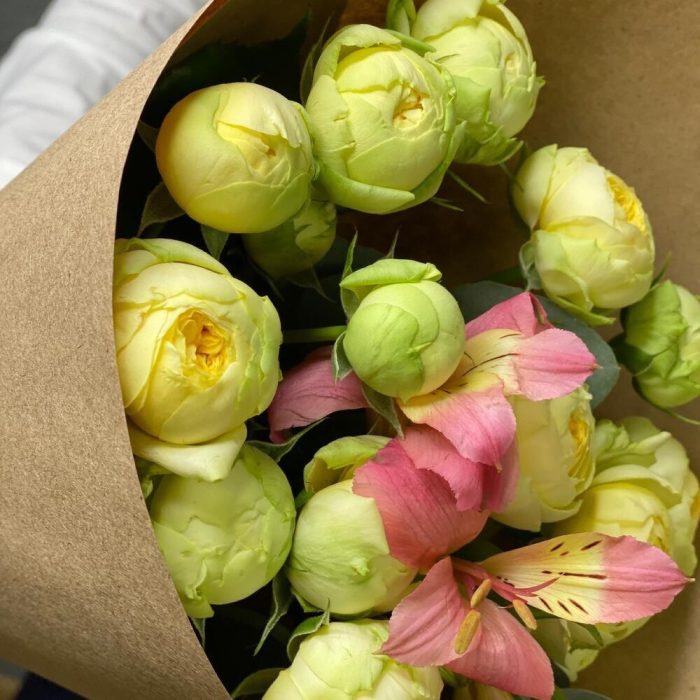 Роза пионовидная желтая – 5 шт. Альстромерия – 1 шт. Крафт – 1 шт. Открыточка с вашими пожеланиями – 1 шт. доставка – 1 шт.