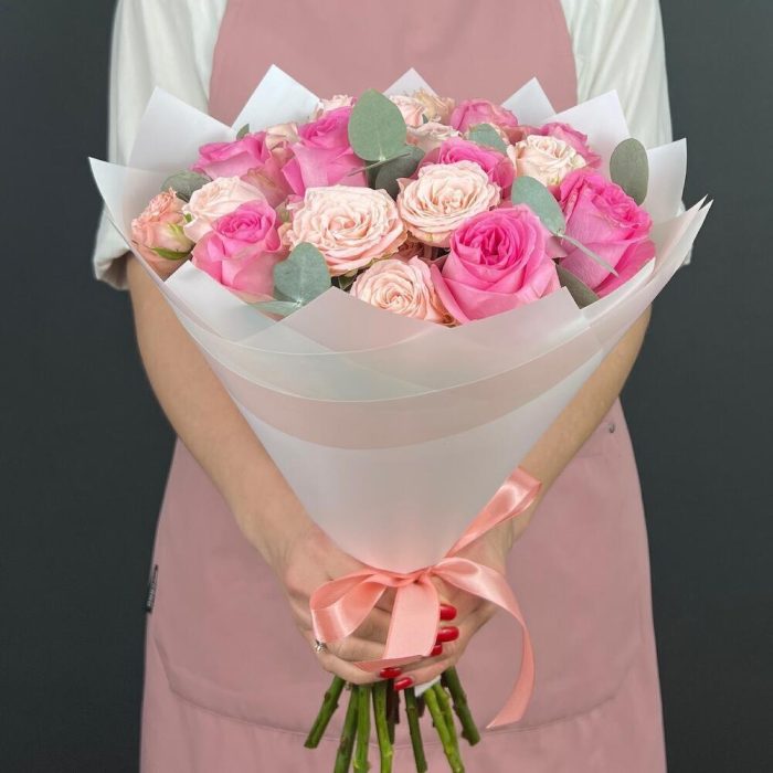 Роза кустовая пионовидная – 7 шт.Роза одноголовая – 9 шт.Эвкалипт – 5 шт.бумага дизайнерская – 6 шт.Лента атласная – 1 шт.