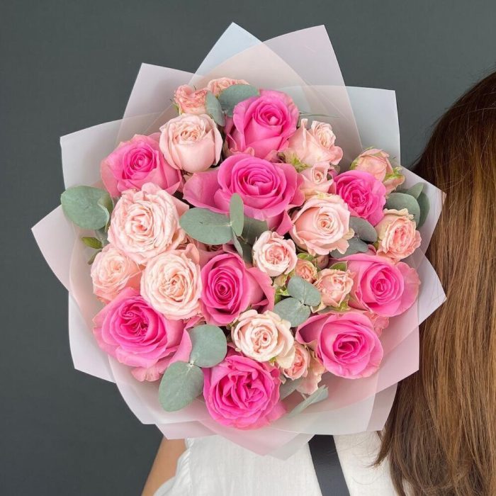 Авторский букет из розовых Пионовидных Роз и Эвкалипта