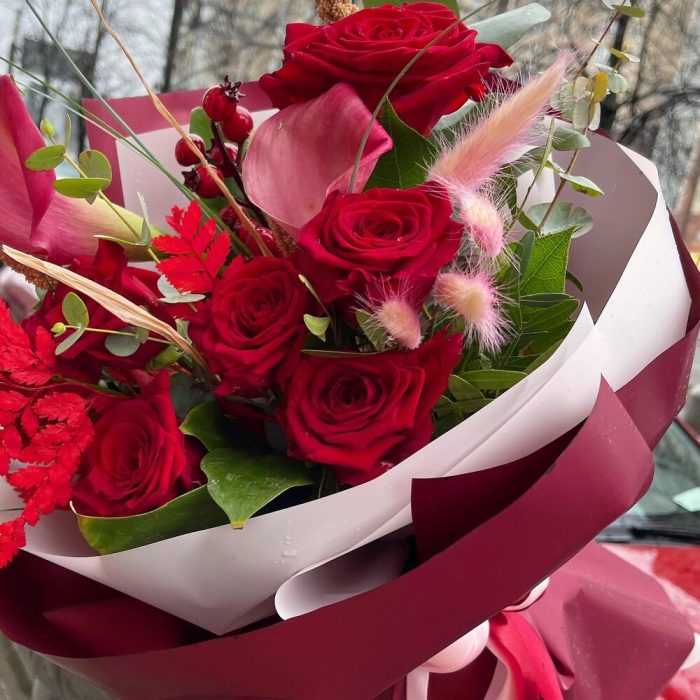 Роза – 7 шт.Ягоды декоративные – 1 шт.Лента атласная – 2 шт.каллы бордовая – 2 шт.пароротник – 1 шт.Пленка матовая – 4 шт.Салал пучок – 1 шт.Эвкалипт – 1 шт.Лагурус (сухоцвет) – 5 шт.сетария сухоцвет – 3 шт.
