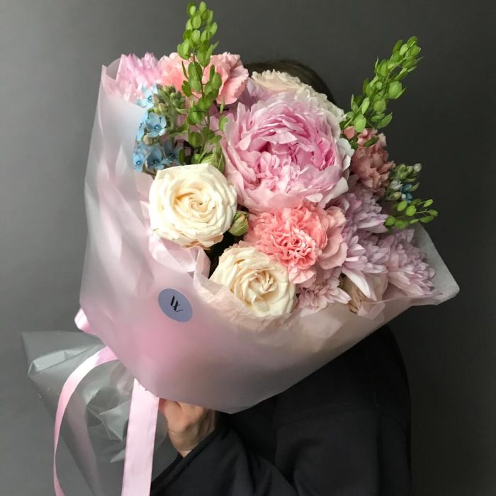 Роза кустовая пионовидная – 2 шт.Хризантема кустовая – 2 шт.Диантус – 3 шт.Пион – 1 шт.пастушья сумка зелень – 1 шт.Оксипеталум – 2 шт.Упаковка дизайнерская – 1 шт.Лента атласная – 1 шт.Открыточка с вашими пожеланиями – 1 шт.